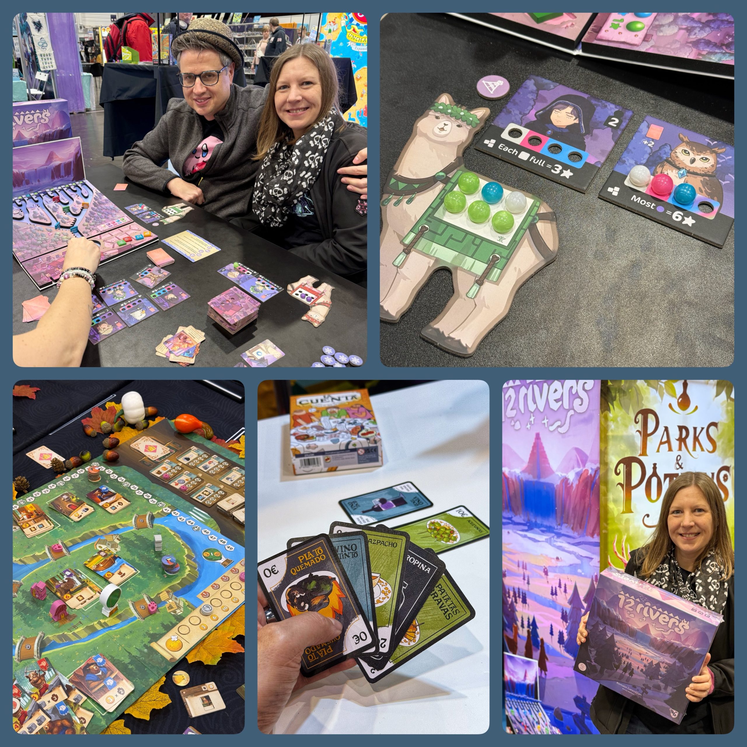 Gespielt haben wir dieses Jahr tatsächlich recht viel auf der Messe. Trotz des Lärms und den vielen Leuten konnten wir immer recht gut abschalten und uns auf die Spiele konzentrieren, das funktioniert überraschend gut, wenn man sich darauf einlässt. In der Regel spielen wir natürlich eher einfachere Spiele und dann ja auch nicht immer zu Ende. Man sollte sich einfach den nächsten freien Tisch schnappen und auch mal Spiele ausprobieren, die man so gar nicht auf dem Sender hatte. Gespielt haben wir beispielsweise „Kokeshi“, „Burgle Bros Blackjack“, „Postcards“, „Driving me crazy“, „12 Rivers“ und mehr. Manches davon haben wir dann tatsächlich auch gekauft, obwohl es vorher gar nicht auf der Liste war. Das strapaziert zwar das Budget, aber es birgt auch einige Überraschungen. So war einer der Überraschungshits für uns „La Cuenta“ von „2Tomatoes Games“. Die Testpartie haben wir zu 6t gespielt. Es geht darum, dass wir im Restaurant sind, immer wieder Essen nachbestellen und wir uns möglichst um die Rechnung herummogeln möchten. Wichtig ist also: es soll jemand anderes bezahlen. So kann man sich mit einer Karte bis zur nächsten Runde auf der Toilette verstecken, oder man muss nicht bezahlen, weil man Geburtstag hat. Das Spiel hat allen Beteiligten sehr viel Spaß gemacht, also auch uns… direkt eingepackt.