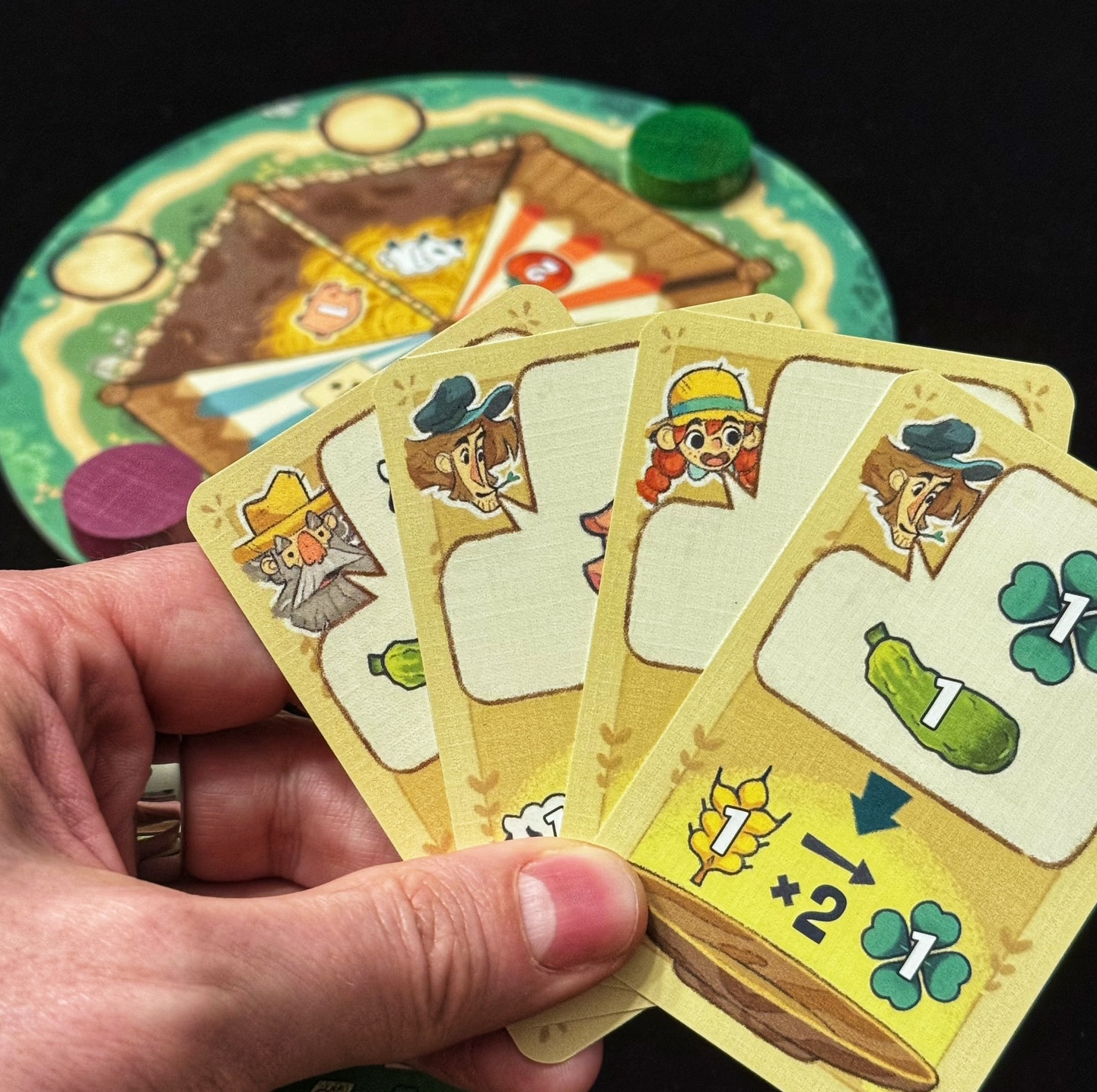 Die 8-seitige Anleitung bringt die einfachen Regeln gut rüber. Alles ist gut erklärt. Auf der Rückseite sind alle Symbole in einer Übersicht dargestellt. Die kaufbaren Zusatzaktionen hat jeder Spieler auf dem Übersichtsplättchen vor sich liegen. Die Optik des Material ist hübsch, fast schon niedlich. Die ganzen Feldfrüchte sind aus Holz und praktisch groß. Die grafische Gestaltung der Karten ist auch hübsch. Zudem ist das ganze Spiel in Deutschland hergestellt. Das ist erst einmal ein Plus, wenn auch der Inhalt des Spiels nach ein paar Wochen immer noch relativ streng riecht, nach dem Öffnen… wobei mir nicht klar ist, ob es das Holzmaterial oder das Kartonmaterial ist… ist aber akzeptabel.